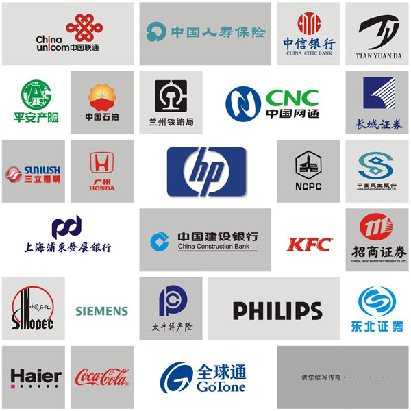 IT通讯行业:三星手机、中国网通、全球通、中国移动、中国联通、中国电信、华为技术……金融保险行业:中国银行、招商银行、交通银行、工商银行、太平洋保险……汽车行业:一汽大众、奥迪、VOLVO、本田汽车……房地产、药业行业及其它行业:嘉洲新城、华北制药、惠丰石化、上海中泰、GPR、中国习行实验研究院、中央电视台……